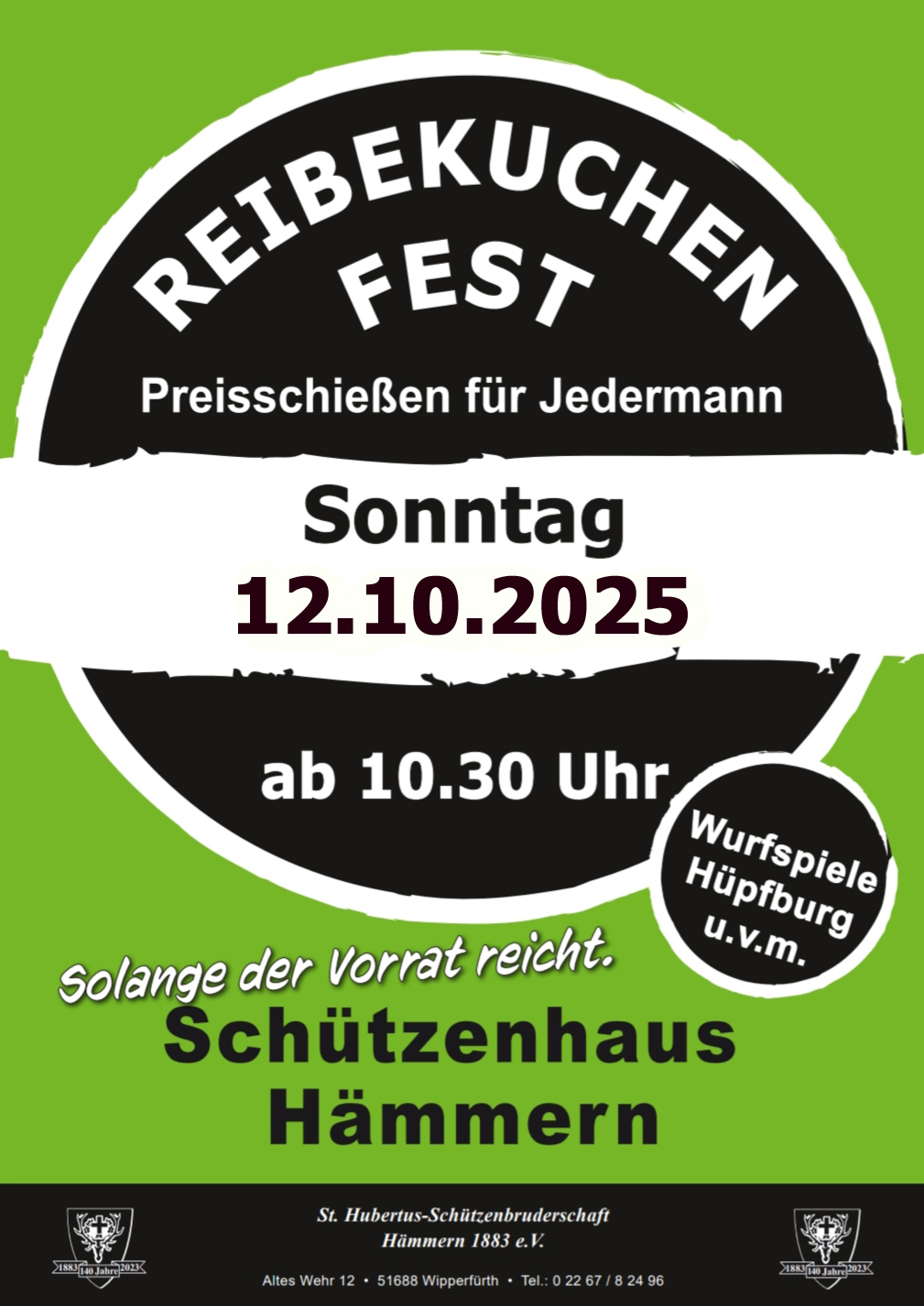 Am Sonntag, den 12. Oktober 2025 lädt die St. Hubertus-Schützenbruderschaft Hämmern zum jährlichen Reibekuchenfest nach Hämmern ans Schützenhaus ein.